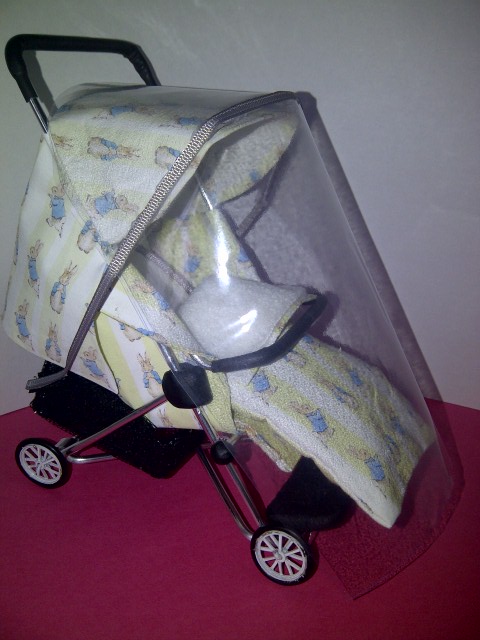 Pushchairs with specially printed fabric, foot muffs, rain covers and matching bags.