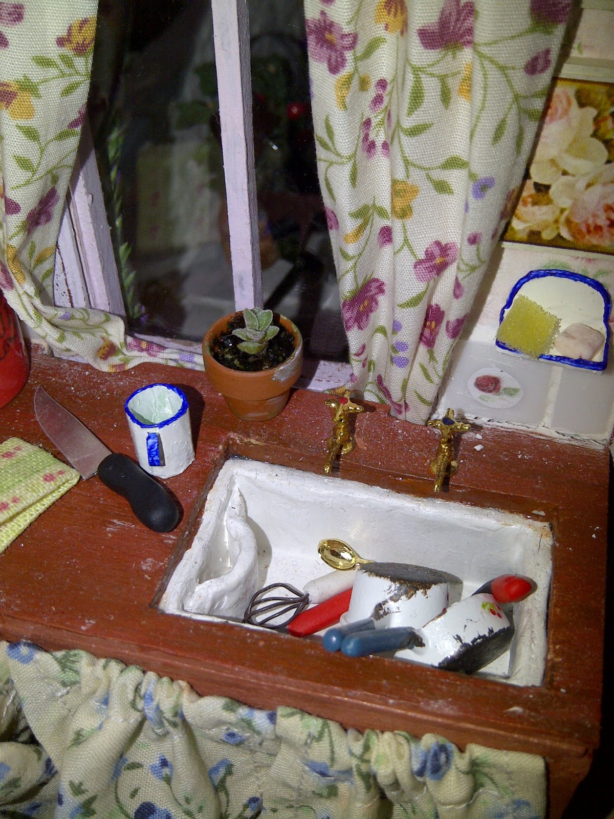 | The pictures on the wall and the tea towel are a lovely gift from Jackie - Friday's Child. I made the cutlery holder, mug and soap dish from card. |